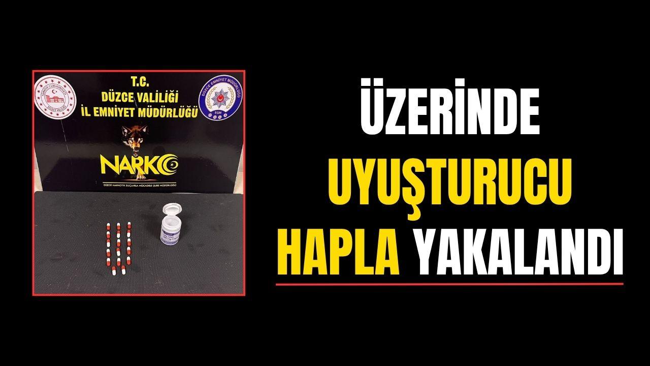 Düzce'de polis ekipleri tarafından yapılan çalışmada daha önceden 4 suç kaydı bulunan şüpheli şahıs 17 sentetik uyuşturucu hap ile yakalandı. H.A. çıkarıldığı mahkemece tutuklandı.
